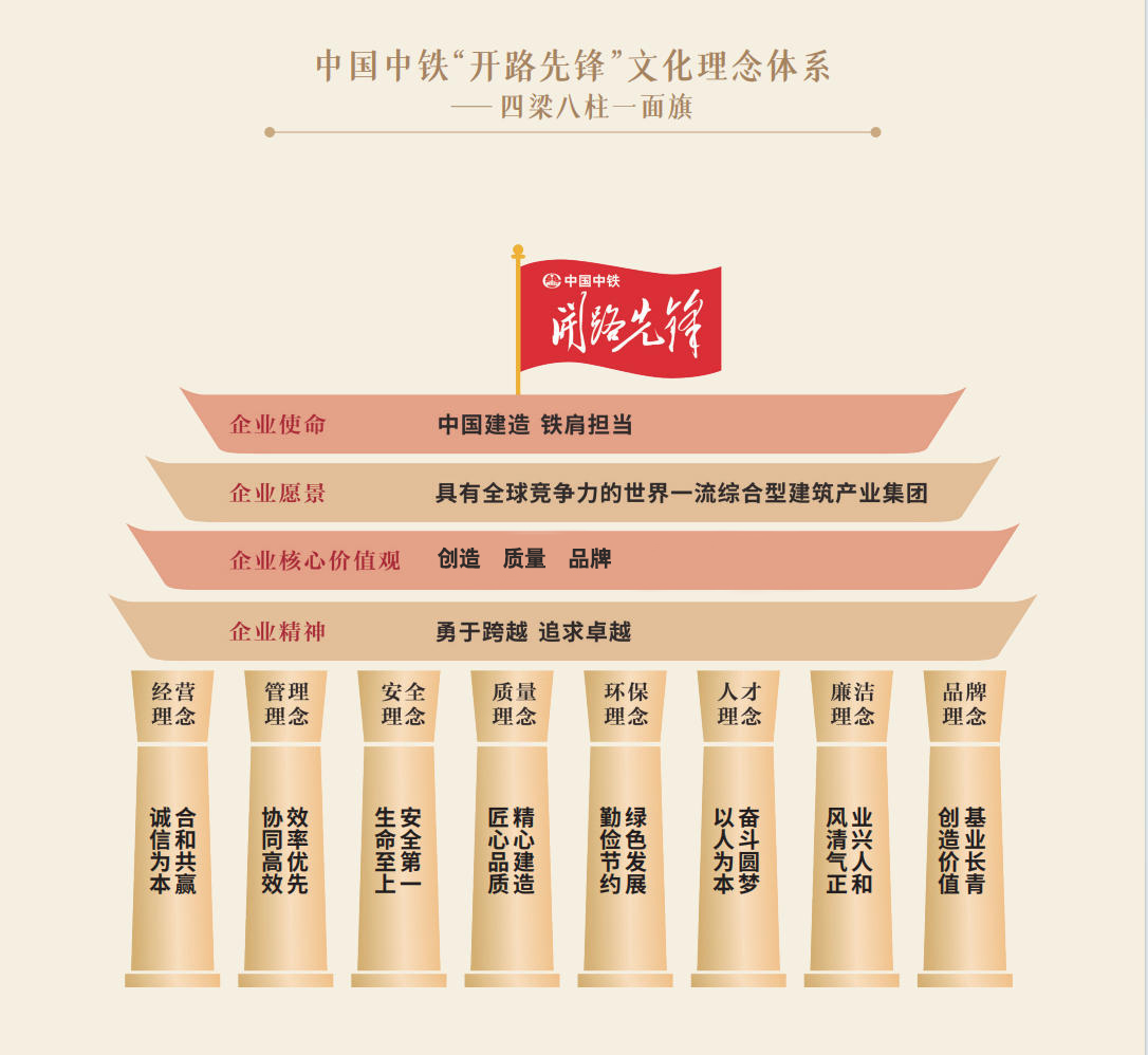 淵源:“開路先鋒”精神的內涵最初為“逢山開路 遇水架橋”。經過一代又一代中國中鐵人的長期實踐,得到了豐富和發展。2004年6月,全公司企業文化建設工作會議將“艱苦奮斗、攻堅克險、爭創一流、尊重科學”作為“開路先鋒”精神的內涵。新時期“開路先鋒”精神的內涵進一步提煉為“愛國奉獻、艱苦奮斗、創新創造、勇爭一流”。2020年,中國中鐵重構企業文化,并在2021年召開的文化建設工作會議上,將企業精神正式命名為“開路先鋒”精神、將企業文化命名為中國中鐵“開路先鋒”文化。