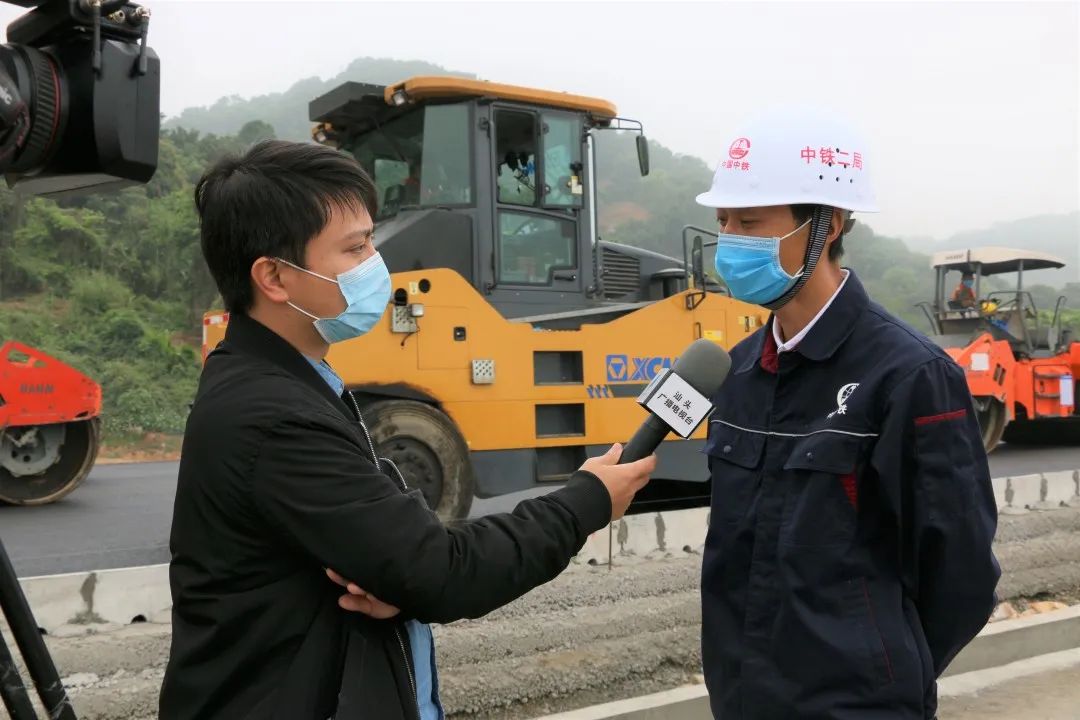 3月31日,汕頭電視臺專程到汕揭項目K14+800-K15+300瀝青路面第二段攤鋪施工現場,對本項目路面攤鋪進行專題采訪報道。