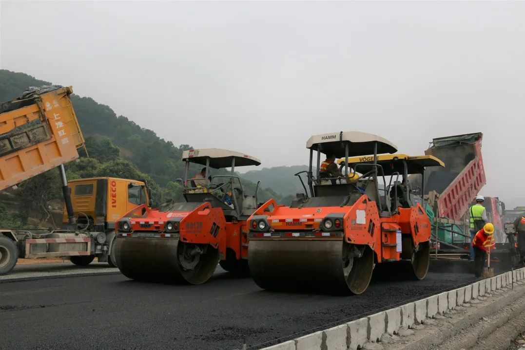 直至晚上8點,第二段路面攤鋪現場兩臺大型瀝青攤鋪機交錯施工,鋼輪、膠輪壓路機,運料車來回穿梭,現場作業人員有序配合,歷時4小時一舉拿下第二段(K14+800-K15+300)500米瀝青路面攤鋪。