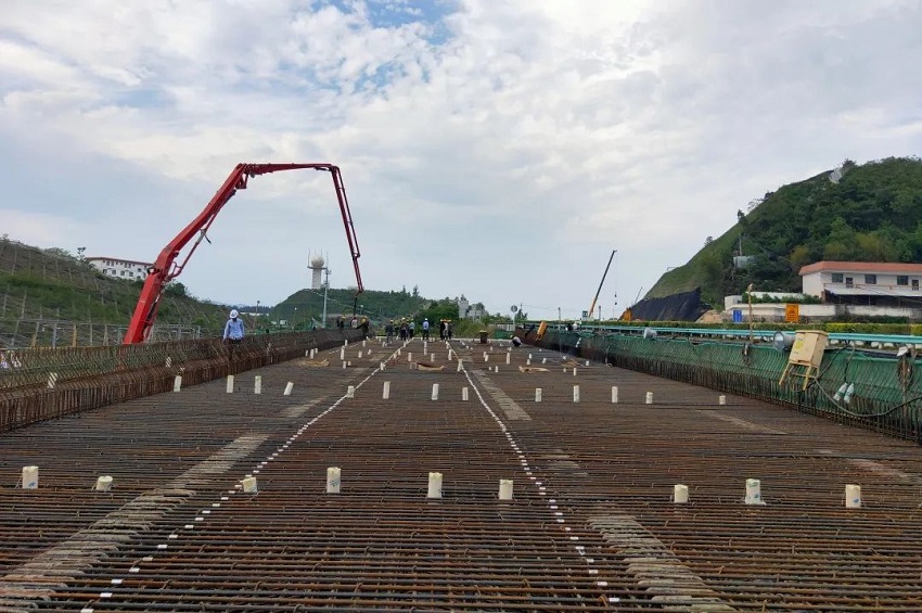 近日,貴州雙龍項目順利完成貓洞河右幅橋箱梁現澆混凝土。 據悉,此次箱梁澆筑采用支架現澆法,兩臺56m泵車配合施工,混凝土設計標號為C50,總設計方量1383m³,采用兩次澆筑,第一次澆筑底板、腹板,澆筑位置由翼緣板與底板倒角位置處以下5cm,澆筑方量為810m³,于4月19日進行施工;此次澆筑混凝土為第二次,澆筑翼緣板及頂板,涉及方量為570m³。
