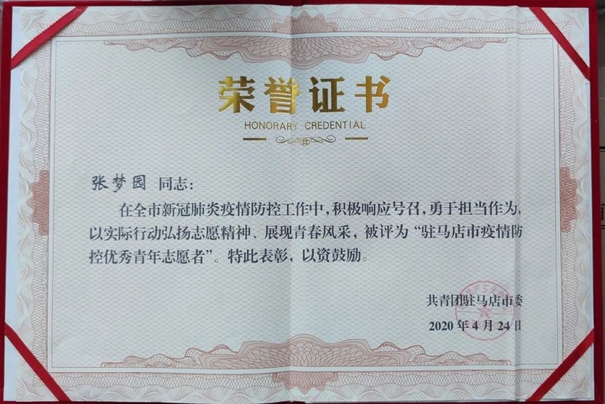 平正公司團(tuán)工委榮獲“駐馬店市五四紅旗團(tuán)委”稱號,辦公室(黨群辦公室)綜合干事張夢園榮獲“駐馬店市疫情防控優(yōu)秀青年志愿者”稱號