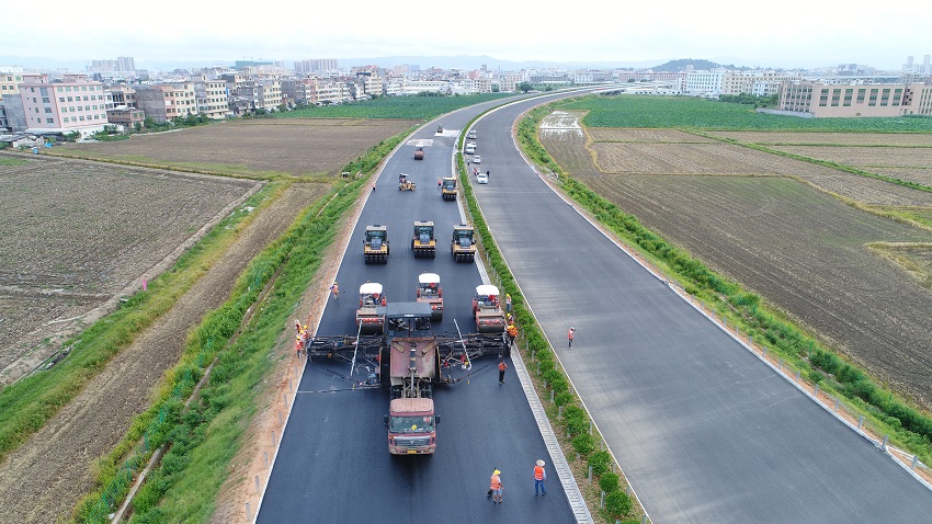 7月8日,汕揭項目第二作業面K27+750-K28+050段瀝青路面上面層試驗段鋪設順利完成。