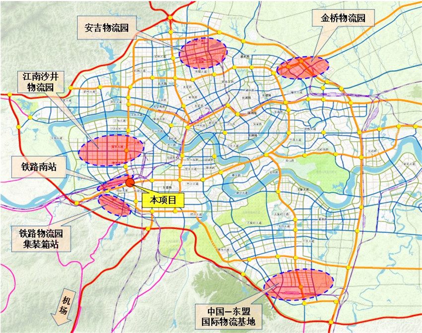 沙井—南站立交位于南寧市規劃“四縱四橫”快速路系統中的第三橫和第一縱交點,處于兩大物流通道交點,是各物流中心與中心區交通聯系通道中的重要轉換節點。南寧市沙井—南站立交工程是目前廣西范圍內設計難度最大、施工情況最復雜、涉及面最廣的大型樞紐互通立交,結構型式為“單首蓿葉與半定向型組合式的三層半全互通立交”,主要包含橋梁工程、道路工程、排水工程、綠化工程、照明工程、交通工程、景觀亮化工程,具有深基坑施工、高壓電塔下施工、地下綜合管線復雜及其整個立交工程數量繁雜、施工工期緊等綜合性特點,安全風險大,且既有鐵路橋下為南寧市著名的十大內澇點之一。項目總投資7.3億元,于2015年1月8日開工建設,2019年1月10日竣工交驗。