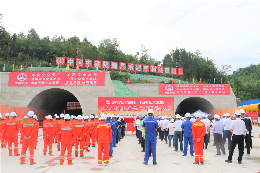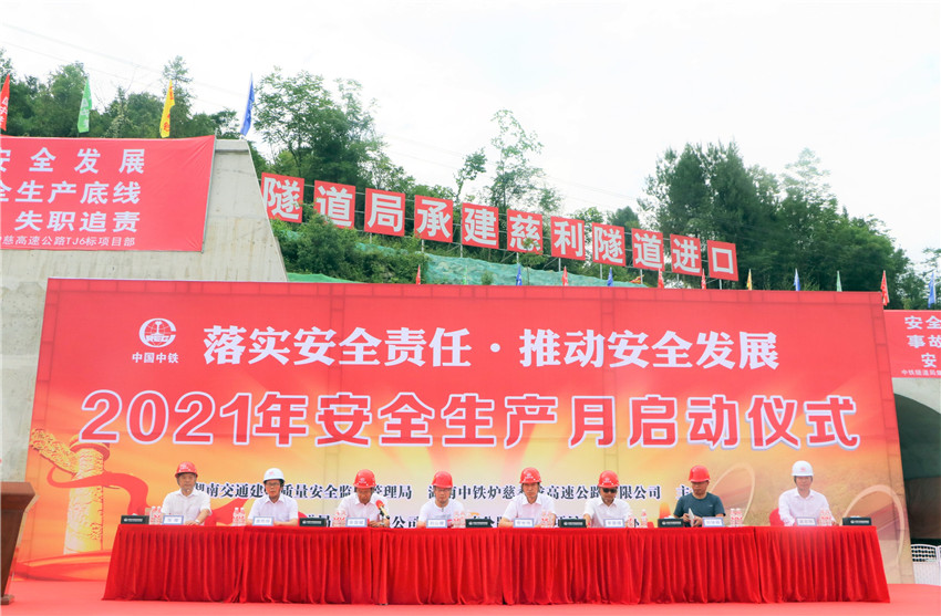 6月1日,爐慈桑龍項目聯合湖南省交通建設質量安全監督管理局在爐慈高速慈利隧道進口舉辦“安全生產月”活動啟動儀式,中鐵交通(中鐵中南區域總部)副總經理、中鐵中南區域(湖南)總部指揮長、項目公司總經理黨世偉出席儀式并作動員講話。
