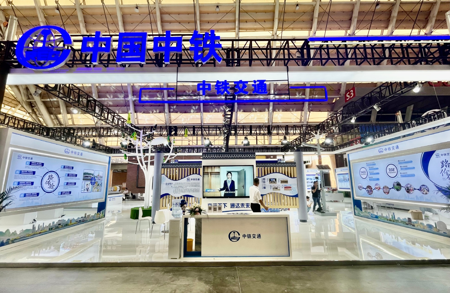 中鐵交通展區以國家綠色低碳、能源融合為理念,圍繞中鐵高速服務區“雙碳”目標,展示了風光能源樹及智慧燈桿,通過風能光伏發電、智慧照明、環境信息采集、信息發布、5G微基站、手機充電、智慧交通等功能,實現多場景消納和低成本綠色能源供給,切實推動高速公路從能源需求向能源供給轉變,打造“零碳收費站”“零碳服務區”。中鐵交通、中鐵長江設計院設置了“中鐵高速數智運維”沙盤,通過展示“空、天、地”一體化檢測監測體系、成套智能檢測裝備、高速通智慧管養平臺、結構監測云平臺、新材料應用等內容,全面展示了高速公路設計、建設、運營等全生命周期管理過程,進一步打造高速公路新質生產力。